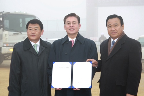 박성효 대전시장과 이완구 충남지사, 정우택 충북지사는 24일 오전 충남 연기군 남면 세종시 중심행정타운 건설현장에서 행정중심복합도시 원안 건설을 촉구하는 공동성명서를 발표했다.