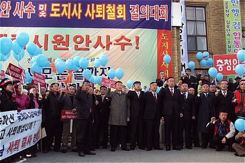 행정도시 원안사수 및 이완구지사 사퇴반대 비상대책위원회와 완사모(이완구 지사를 사랑하는 사람들의 모임) 등 이 지사 지지자 수천명은 4일 오후 2시부터 충남도청에서 '세종시 원안사수와 도지사 사퇴반대 결의대회'를 가졌다.