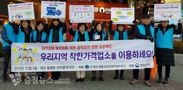 (사)대전세종소비자공익네트워크는 행정안전부 협력사업의 일환으로 5일 대전광역시 월평동 일대에서 지역경제 활성화를 위한 골목상권 상생 프로젝트 '착한가격업소 이용 홍보 캠페인'을 전개했다.