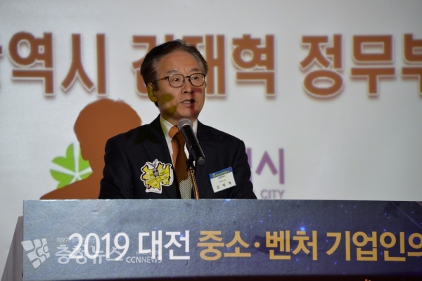 김재혁 대전시 정무부시장은 18일 대전 라마다호텔 2층 로얄볼룸에서 열린 ‘2019년 대전중소기업인의날 행사에 참석해 "중소·벤처기업이 우리경제를 책임지고 있다면서 대전시에서 지원에 최선을 다하겠다"고 밝혔다