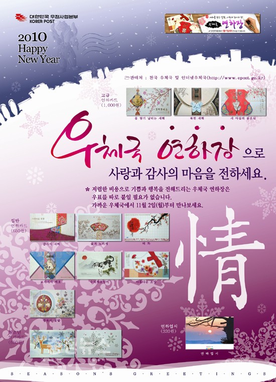 지식경제부 충청체신청(청장 신순식)에 따르면 다양한 종류의 ‘2010년 우편연하장’을 우체국 창구와 인터넷(www.epost.go.kr)를 통해 판매하고 있다.