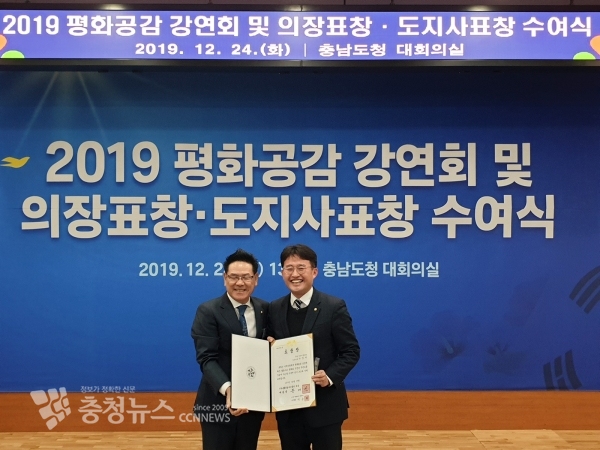 충남도의회 안장헌 의원(아산4·더불어민주당)이 24일 충남도청에서 열린 2019년 민주평화통일자문회의 충남지역회 모범위원 표창 수여식에서 대통령 표창을 수상하는 영예를 안았다.