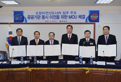 충남도는 29일 오전 도청 소회의실에서 이인화 충남도지사 권한대행과 강태봉 충남도의회의장, 김종성 충남도교육감, 박종준 충남도지방경찰청장, 김광배 충남개발공사사장, 성증수 한국토지주택공사 대전충남본부장이 참석한 가운데 도청신도시 이전을 위한 양해각서(MOU)를 체결했다.