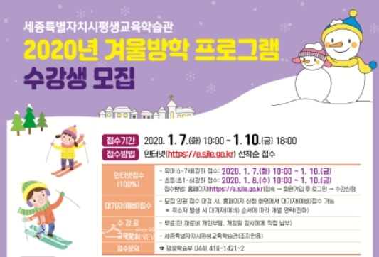 세종특별자치시평생교육학습관(관장 정영권)은 2020년 겨울방학을 맞아 열리는 유아·초등 대상 12강좌의 수강생을 1월 7일(화)부터 모집한다.