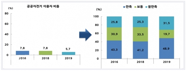특히 공공자전거(어울링) 이용 만족비율은 48.9%로 2018년 대비 7.7%p 증가했고, 불만족 이유는 대여소 위치 불편이 26.2%로 가장 높았다.