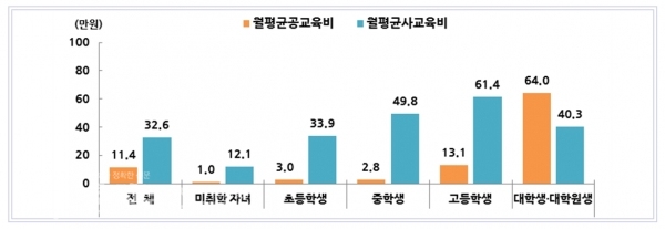 올해 ‘월평균 공교육비’는 11.4만 원, ‘사교육비’는 32.6만 원으로 집계됐고, 학생이 있는 가구 중 교육비가 부담스럽다고 응답한 비율은 53.6%이며, 교육비 부담요인으로 ‘보충교육비’(79.8%)를 꼽았다.