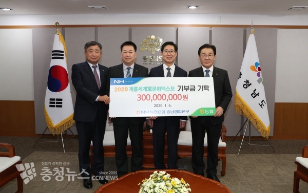 이날 기탁식에는 최홍묵 계룡시장, 도와 군문화엑스포 조직위, NH농협은행 관계자 등 10여 명이 참여했다.