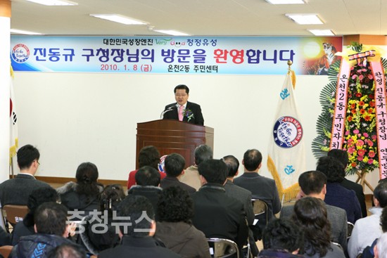 8일 온천2동 주민센터를 연두방문한 진동규 유성구청장은 “온천2동은 유성의 과거와 현재 미래가 공존하는 지역으로 10년내 유성의 중심축으로 발전할 것”이라며 “역동적인 진품 도시, 더욱 빛나는 청정유성 건설을 위해 다 함께 노력하자”고 주문했다.