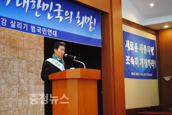 새로운 세종시 및 4대강 살리기 범국민연대 최청락 사무총장은 " 새로운 세종시로 선진국가 건설하자" " 충청도민 똘똘뭉쳐 세종시법 개정하여, 새로운 세종시로 충청발전 이룩하자"면서 최근 일부 몰지각한 정치세력들이 우리의 세종시를 정략적 이용하고 있다고 강하게 비판했다.