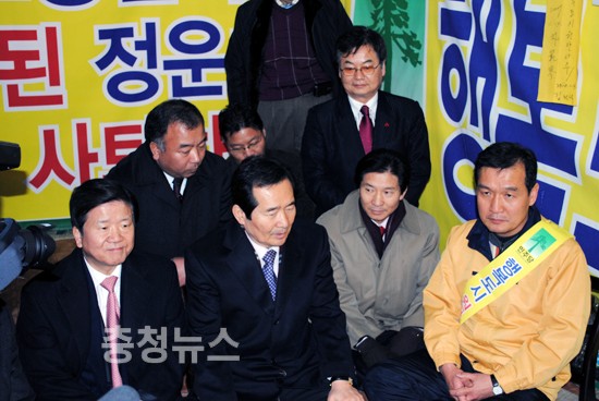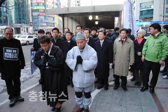 세종시 수정안 저지를 위한 선병렬 시당위원장의 단식 농성장이 마련된 대전역 광장과 김원웅 민주당 전 의원의 삼보일배가 진행중인 둔산동 갤러리아 백화점 앞으로 정세균 민주당대표가 격려방문했다.