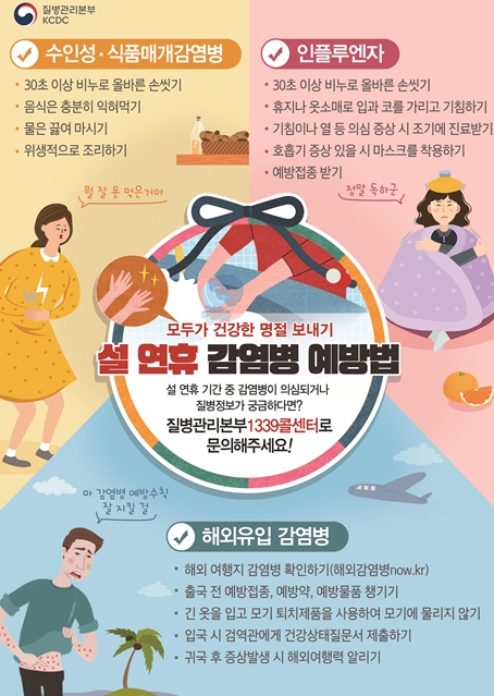 설 연휴기간 동안 상온에 장시간 노출되어 부패할 수 있는 음식의 공동섭취 및 사람간 접촉 증가에 따른 수인성·식품매개감염병 및 인플루엔자 발생에 주의해야 하며, 해외여행 시에는 홍역, 뎅기열과 중국 우한시 폐렴 등에 주의해야 한다.