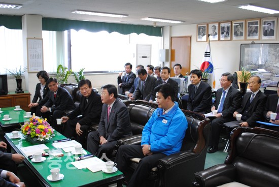 ▲ 정용기 대덕구청장 박성효 시장 연두방문을 환영하고 있다