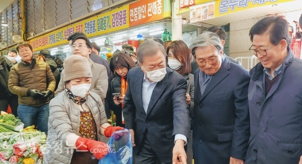 주민 간담회에 이어 문 대통령은 양 지사와 함께 온양온천전통시장으로 이동, 시장을 돌아보며 상인들을 격려했다.