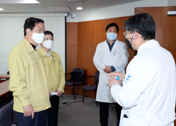 장종태 대전 서구청장이 24일 코로나19 선별진료소인 을지대학교병원, 건양대학교 병원, 서구보건소를 차례로 방문해 코로나19 확산방지의 최일선에서 뛰고있는보건의료 관계자들을 격려했다.