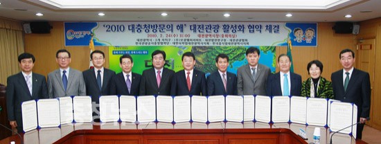 대전광역시는  24일 오전 시청 중회의실에서 ‘2010 대충청방문의 해’ 추진상황 보고에 이어, 5개 자치구와 지역내 관광분야 기관․단체들, 그리고 (주)보광훼미리마트와 추진사업들의 성과 거양 및 대전관광 활성화를 위한 상호협력 협약을 체결했다.