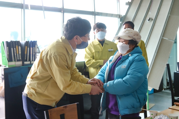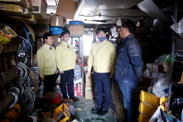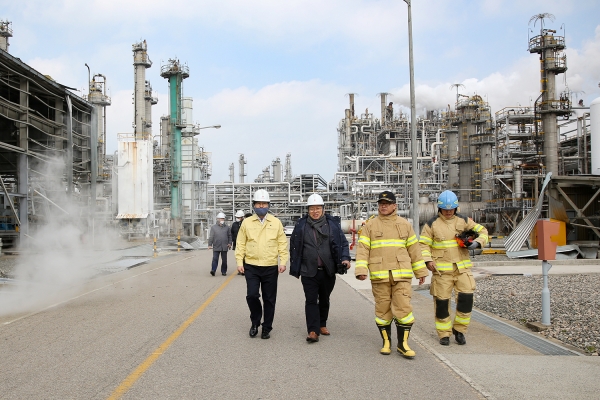 맹정호 서산시장이 롯데케미칼 폭발사고 현장을 찾아 관계자들과 수습방안 및 재발방지대책을 논의하고, 피해를 입은 대산지역 시민들을 위로하고 있다.