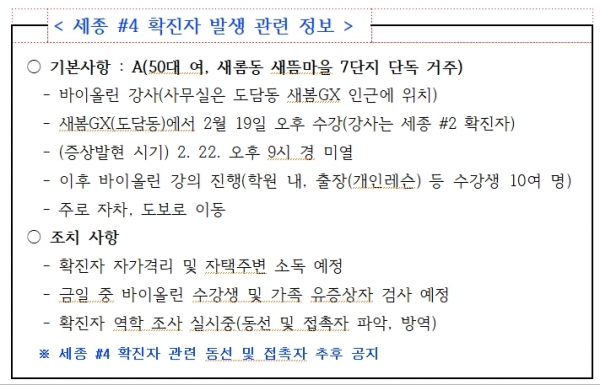 8일 세종시에 따르면 #4번(50대 여성, 새롬동), #5번(40대 여성, 고운동) 모두 도담동 줌바 댄스 수강생이다. 이에 따라 세종 거주 코로나19 환자는 5명으로 늘어났다.