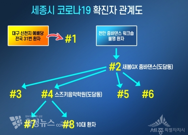 이들 확진자 중 4명(세종 #3~6)은 2번 확진자가 운영하는 줌바 교습소 수강생들로, 지난 2월 19일에서 21일 사이 감염된 것으로 추정하고 있으며,  나머지 2명(세종 #7~8)은 4번 확진자의 접촉자이다.