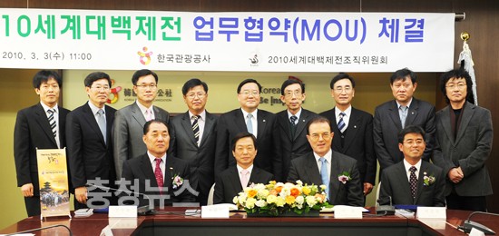 세계대백제전 조직위원회(위원장 최석원) 는 오늘 오전 서울 중구 청계천로 한국관광공사 16층 회의실에서 관광공사 이 참 사장을 비롯한 임직원 등 양측 관계자가 참석한 가운데 상호 업무협력 협약식(MOU)을 갖고 외국 관광객 유치 확대를 위해 공동 노력키로 합의하였다.