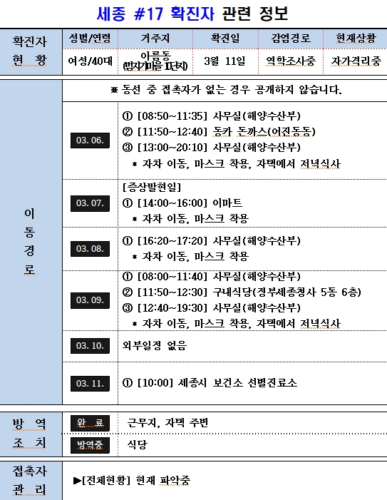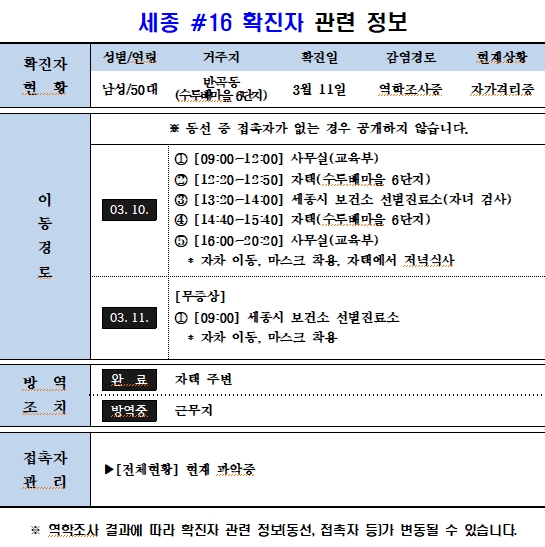 세종시 방역당국이 11일 오후 6시 기준 '코로나19' 16~17번 확진 환자의 동선을 공개했다.