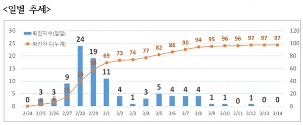 한편 천안시는 확진자 97명중 완치자가 12명 (3/6 1명, 3/11 4명, 3/12 3명, 3/13 1명, 3/14 1명, 3/15 2명퇴원)으로 늘어났다.
