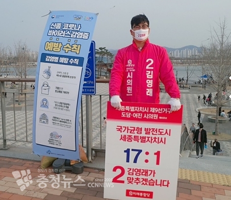 그러면서 “국가균형 발전도시 세종특별자치시 민주당 17, 비례대표 통합당 1의 기울어진 현재의 세종시의회로는 문제가 있다"며 "세종시 균형추 역할을 김영래가 수행하겠다”며 지지를 호소했다.