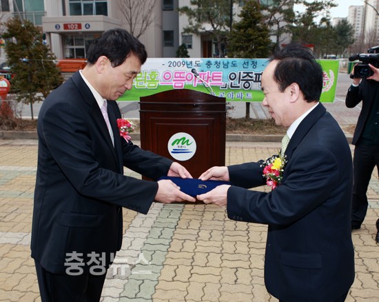 계룡시 금암주공아파트(274세대)에서 “2009 그린홈 으뜸 아파트” 인증동패 현판식이 열렸는데 현판식에는 이인화 충남도지사권한대행, 최홍묵 계룡시장, 양두옥 입주자대표회의회장, 입주민 등 내‧외빈 100여명이 참석하여 자리를 빛냈다.