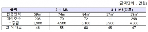 2-1M3는 전용 59㎡~84㎡까지 다양한 타입으로 구성되어 있으며 348세대를, 3-1M5(리츠)는 소형 위주로 구성되어 있으며 309세대를 공급한다.