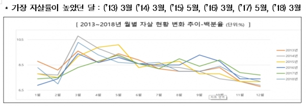 2013년부터 2018년까지의 통계자료를 보면 3월부터 5월까지의 자살률은 꾸준히 높게 나타나고 있으며, 2019년 당진시 월별 자살현황을 살펴보아도 5월에 자살률이 다른 시기보다 가장 높게 나타남을 알 수가 있다.
