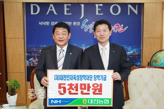 평소 대전지역의 인재육성에 높은 관심을 갖고 있는 농협대전지역본부(본부장 김종화)에서는 23일 오전 대전시청을 방문해 대전인재육성장학재단(이사장 박성효)에 장학기금 5천만원을 기탁했다.