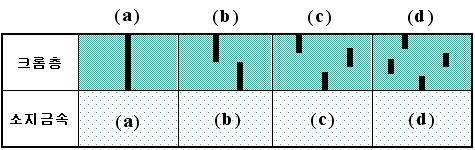 본 연구에서는 이러한 생성 균열이 외적인 응력에 의하여 성장하여 코팅층의 두께에 다다를 때에 코팅층의 탈락이 유발되게 되는 것으로 추정하여 코팅층 내의 관통균열이 없는(그림 2) 도금 공정 개발로 균열을 짧게 하기 위한 방법으로 단층(one layer)과 다층(multi-layer)을 실험적 검증을 시도하여 모두 가능성을 확인 하였지만, 이중 산업적 활용측면에서 보다 경제적인 단층방식으로 코팅층 구성을 선택하여 가능한 많은 균열이 단속적으로 생성되는 전해조건 최적화 연구함.