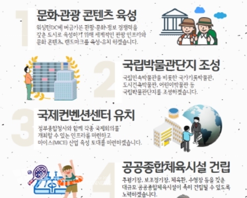이에 홍 후보는 “행정수도의 위상을 넘어 문화관광도시 조성을 위해 국가적 차원의 관광 인프라와 국제적 수준의 문화 콘텐츠, 랜드마크를 육성·유치 하겠다”고 하면서 “세종을 워싱턴DC에 버금가는 세계적인 관광·문화·정보산업 경쟁력을 갖춘 도시로 육성하겠다”고 포부를 밝혔다.
