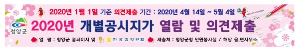충남 청양군(군수 김돈곤)이 2020년 1월 1일 기준 16만4796필지에 대한 개별공시지가 조사와 산정을 마치고, 토지소유자 또는 이해관계인의 의견을 듣기 위해 4월 14일부터 5월 4일까지 20일간 열람기간을 운영하고 의견 제출서를 접수한다.