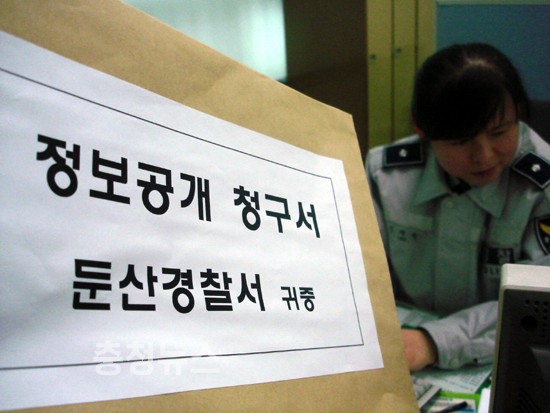 박종범(전 민노총 대전본부 사무처장) 씨가 31일 오후1시 둔산서 민원실에 대전둔산경찰서 7개과 29개팀 운영비 지출내역 정보공개 청구를 접수시키는 보기 드문 일이 발생했다.