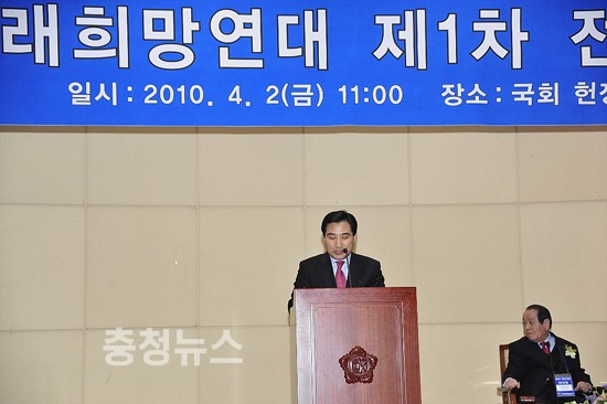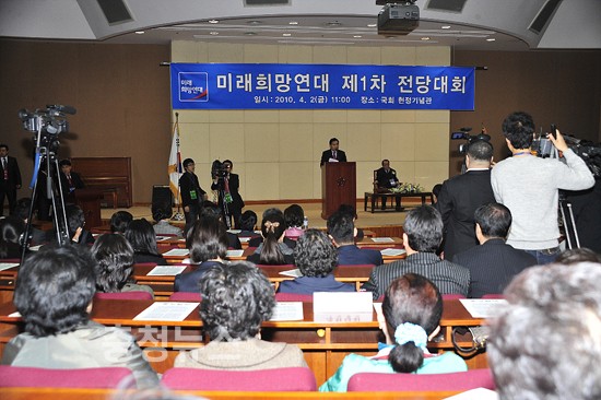 재적 대의원 128명 중 91명이 출석하였고, 출석 대의원 전원 만장일치의 찬성으로 미래희망연대와 한나라당과의 합당 안건이 의결처리 되었음을 밝힌다.