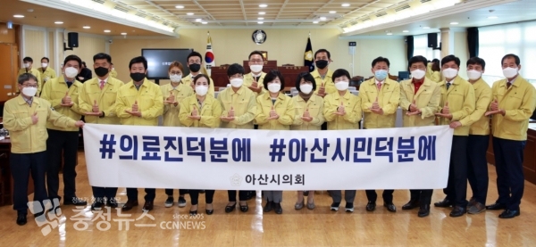 아산시의회(의장 김영애)는 최근 코로나19 응원캠페인 ‘덕분에 캠페인’에 참여해 아산시민과 의료진께 감사와 존경의 메시지를 전했다.