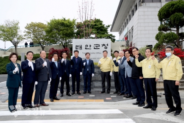군은 지난 1일 군청 정문에서 가세로 군수와 군의원 등이 모인 가운데 ‘태안군청 표지 제막식’을 간소하게 실시하고, 앞으로 군민의 행복을 최우선으로 ‘다함께 더불어 더 잘사는 새태안’ 건설에 최선을 다할 것을 다짐했다.