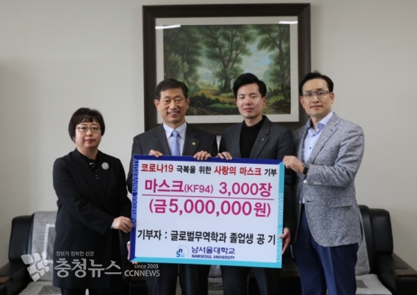 남서울대학교(총장 윤승용)는 ㈜컨로테크 및 아시아마스터트레이드(주)로부터 외국인 유학생을 위한 마스크 3000장을 7일 기증받았다.