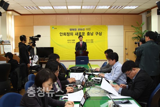 더불어 한나라당 도지사 후보로서 세종시 수정안 당론을 따르겠다고 했는데 거기에 대해서 명확히 밝힐것 을 요구하자 “도정을 맡겠다고 하는 도지사 후보로서는 수정안에 동의하면 안된다.”또한 “ 도민의 여망을 짓밟는 일이고 도정 발전에 부합하지 않는 일이다.”라고 밝히며 “세종시 보다 더 큰것을 주겠다는 대통령과 총리의 말은 거짓말이다. 세종시보다 더 큰 것은 없다.”라며 세종시는 반드시 지켜야 한다고 밝혀 앞으로 안 후보의 행보에 귀추가 주목된다.