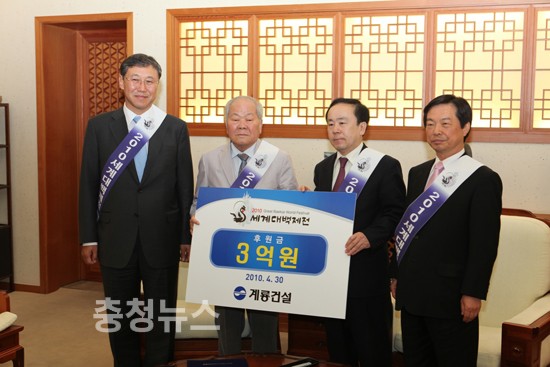 계룡건설(주) 이인구 명예회장이 30일 오전 충남도 방문, 2010세계대백제전 성공개최 위해 행사 후원금으로 3억원을 기탁했다고 충남도와 2010세계대백제전 조직위원회가 밝혔다.