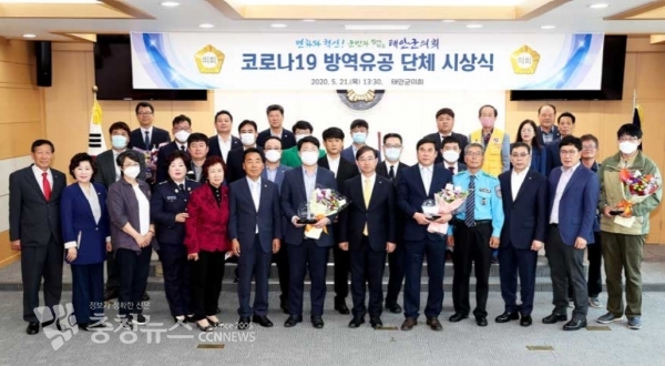 이번 시상식은 코로나19의 관내 유입을 사전에 차단하고자 자발적인 방역 활동 등에 참여하여 군민안전에 기여한 단체들에 감사의 마음을 전하기 위한 것으로 태안군새마을부녀회와 태안군지역자율방재단, 태안군남녀의용소방대, 태안군 자율방범연합대, 태안군 모범운전자회, 태안군보건의료원 의약방역팀 등이 수상의 영예를 안았다.