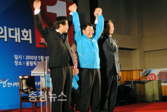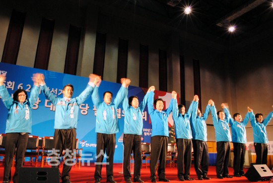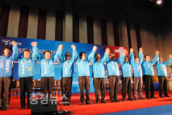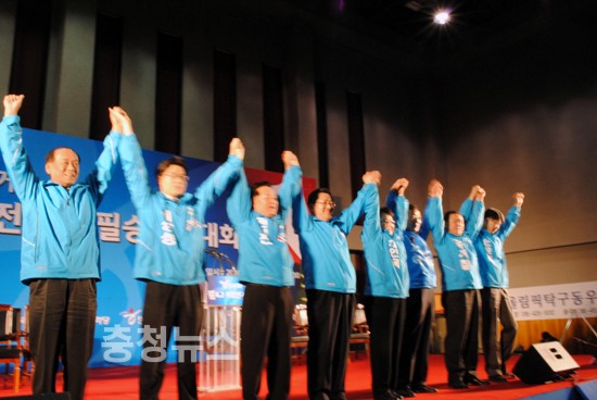 ▲ 한나라당 필승결의대회 이은권 중구청장 후보가 중구 출마자들이 만세를 하고있다