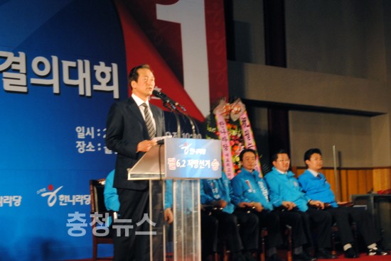 ▲ 한나라당 필승결의대회 정용기 대덕구청장 후보가 핑승을 다짐했다.