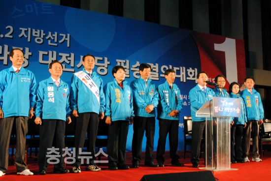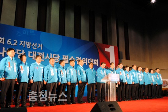 한나라당 대전시당(위원장 송병대)은 1일 오전11시 서구 둔산동 올림픽 기념 국민생활관에서 6,2지방선거 공천을 마무리한 이후 첫번째 대규모 필승결의대회를 열고 본격적인 선거전에 돌입했다.