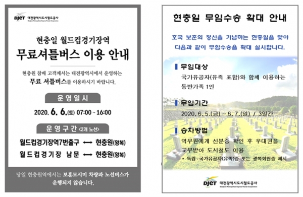 이에 따라 공사는 현충원역 노선버스 변경사항과 월드컵경기장역 무료 셔틀버스 운행 안내문을 22개 전 역사에 부착하고, 현충일 당일 역사와 열차에서 안내방송을 실시하기로 했다.