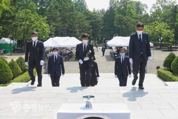 최 교육감은 "순국선열과 호국영령들께 헌화하고 향을 사르면서 우리 아이들의 안전을 기원하고 미래를 이끌 주역으로 바르게 성장할 수 있게 지원할 것"을 다짐했다.