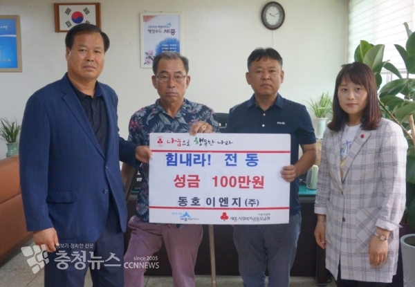 세종사회복지공동모금회(회장 홍영섭)는 세종특별자치시에 위치한 ㈜동호이엔지(대표 이호철)가 12일 전동면 취약계층을 위해 성금 100만원을 전동면지역사회보장협의체에 기탁했다.
