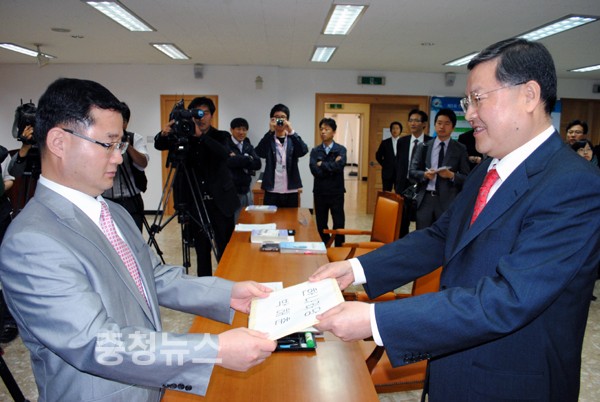 한나라당 박해춘 충남 도지사 후보가 13일 오전 후보 등록후 예고없이 도청 기자실을 방문했다.