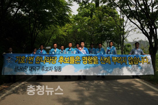 한나라당 정요기 구청장 후보를 비롯한 대덕구 지방선거 출마자들이 바쁜 선거운동기간에도 불구하고15일 오전 9시 장동산림욕장을 시작으로 오전 10시 계족산 용화사 입구에서 ‘자연보호 캠페인’ 활동을 펼쳐 주목을 받고 있다.