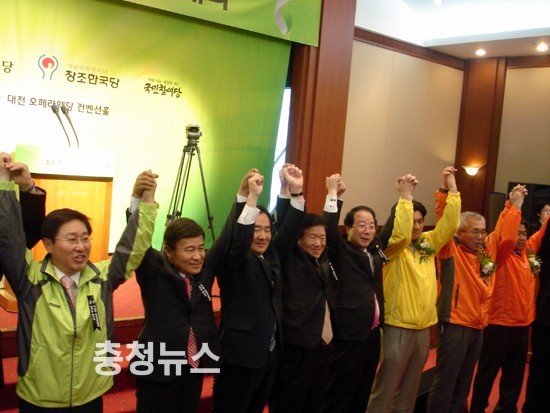 민주당과 민주노동당, 창조한국당, 국민참여당 등 대전지역 야 4당이 19일 김원웅 민주당 대전광역시장 후보 선거사무소에서 선거대책위원회 발대식을 갖고 본격적인 선거전에 돌입했다.